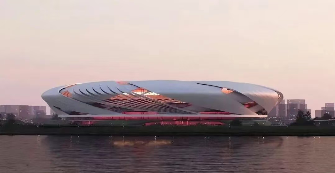 長沙是中國革命的發(fā)源地,方案以“紅色搖籃,蝶舞湘江”為創(chuàng)作原點,由正反各九片單元網(wǎng)殼交錯疊合,與內(nèi)部的紅色體育場共構(gòu)體育場基本形態(tài),使長沙這片熱土淬煉出的人文精神盡顯于丹韻銀律的編織錯動之中。