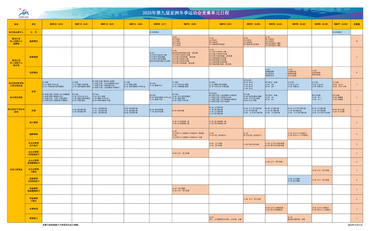 1月1日,2025年第九屆亞冬會(huì)組委會(huì)發(fā)布了亞冬會(huì)競(jìng)賽單元賽程。2月4日上午的冰壺混雙循環(huán)賽,將是中國隊(duì)在本屆亞冬會(huì)上的第一次出場(chǎng)。2月4日晚,中國男子冰球隊(duì)首場(chǎng)對(duì)陣韓國隊(duì)。首枚金牌將在2月8日上午產(chǎn)生。備受關(guān)注的短道速滑比賽金牌將在2月8日和9日產(chǎn)生。