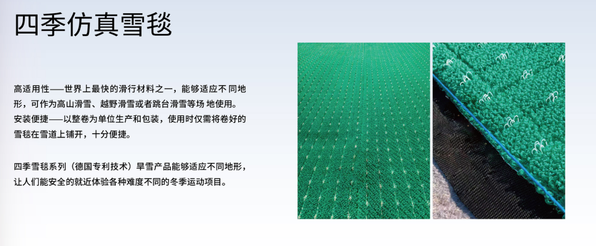 季雪毯系列(德國(guó)專利技術(shù))旱雪產(chǎn)品能夠適應(yīng)不同地形,讓人們能安全的就近體驗(yàn)各種難度不同的冬季運(yùn)動(dòng)項(xiàng)目。