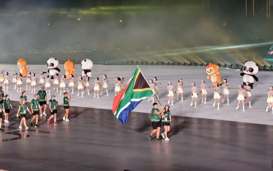 吉祥物“蜀寶”和“錦仔”引領(lǐng)各國運(yùn)動(dòng)員入場(chǎng)。吉祥物以大熊貓和川金絲猴為原型,命名以“蜀錦”為靈感。此外,吉祥物的設(shè)計(jì)傳達(dá)了巴蜀文化意蘊(yùn),成都的芙蓉花瓣演繹大熊貓的內(nèi)耳;三星堆出土文物幻化成川金絲猴的耳朵;蜀錦的質(zhì)感與綠水青山融合,編織成吉祥物的服飾;太陽神鳥紋樣則成為服飾上的圖案。